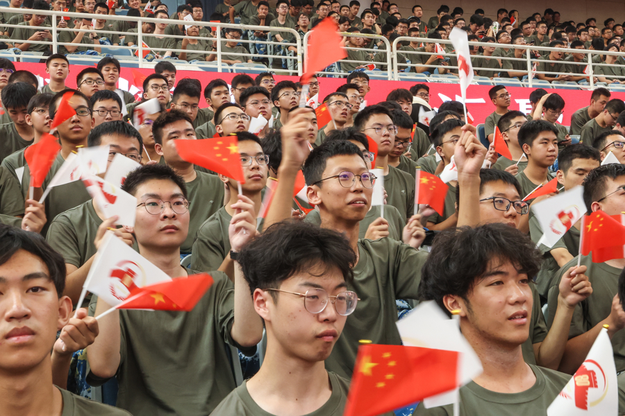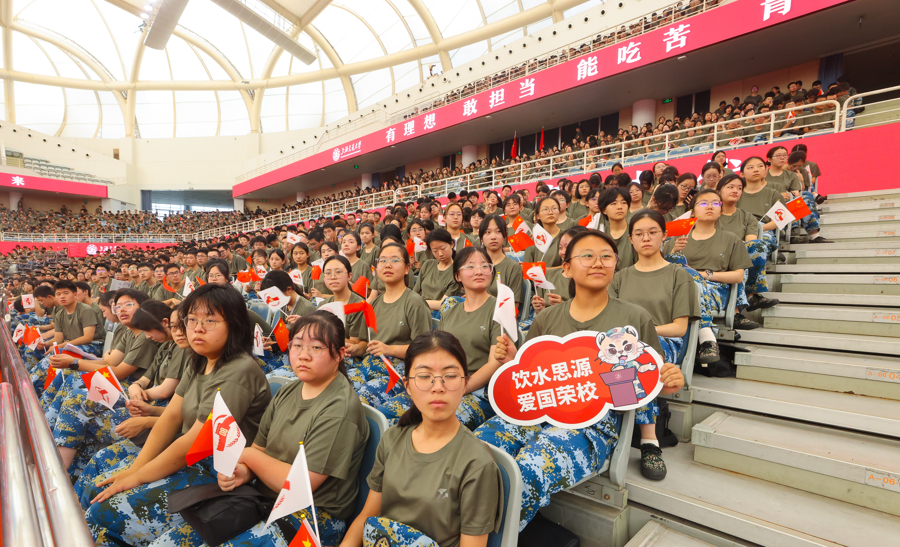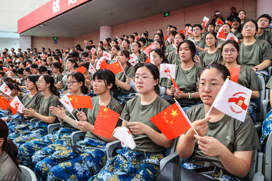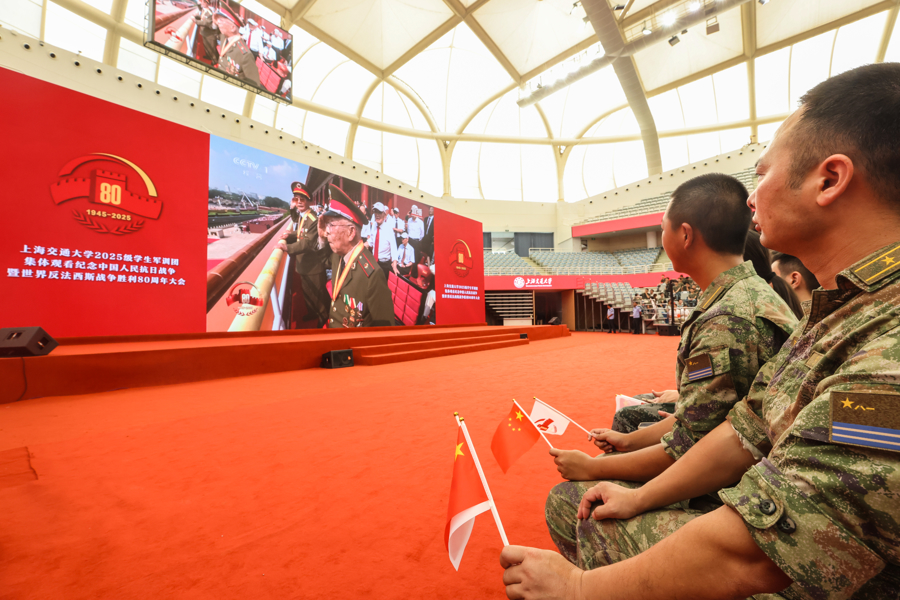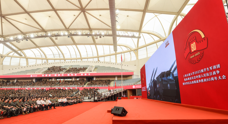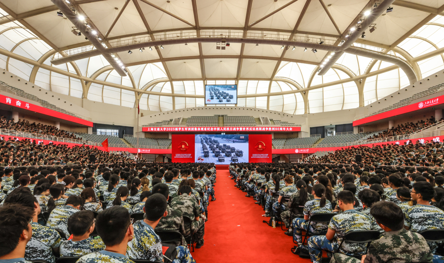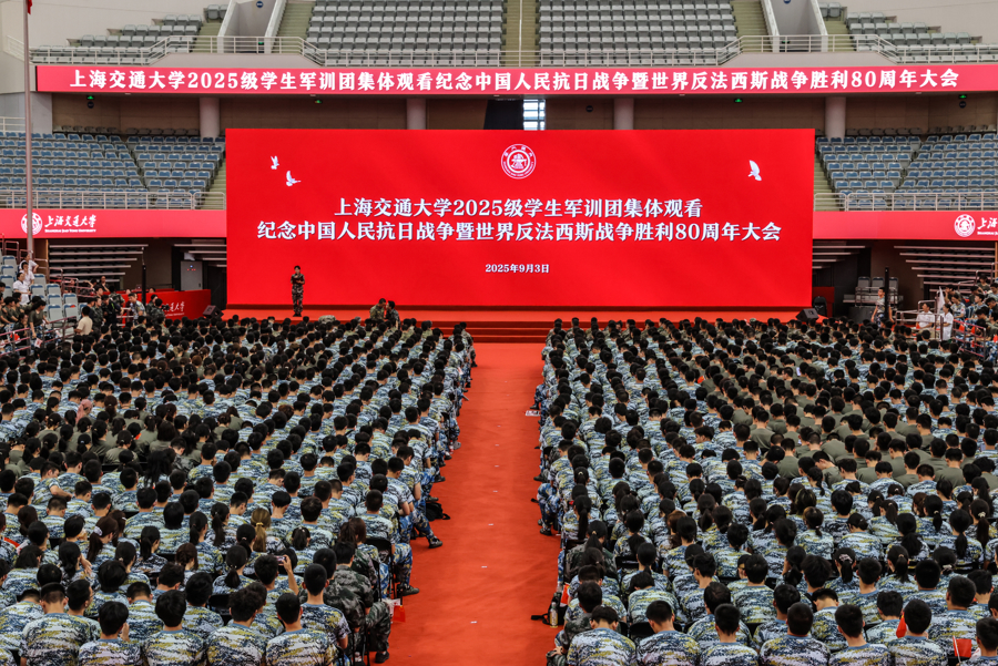 今天上午,上海交通大学2025级学生军训全体参训师生在闵行校区霍英东体育中心集体观看纪念大会实况转播,见证这一庄严时刻。