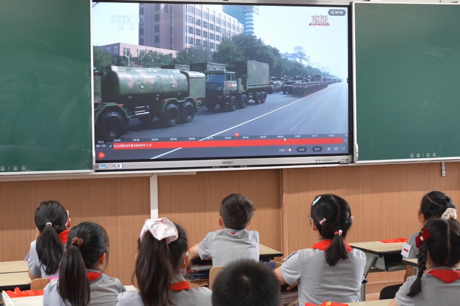 “解放军叔叔阿姨用日复一日的刻苦训练安信,把整齐划一的方阵走出了中国气势,那些先进的武器装备,更让我们感受到国家强大的底气。作为一名中国人,我感觉非常自豪!”适存小学三年级学生王雨晴在观看阅兵式后感叹道。