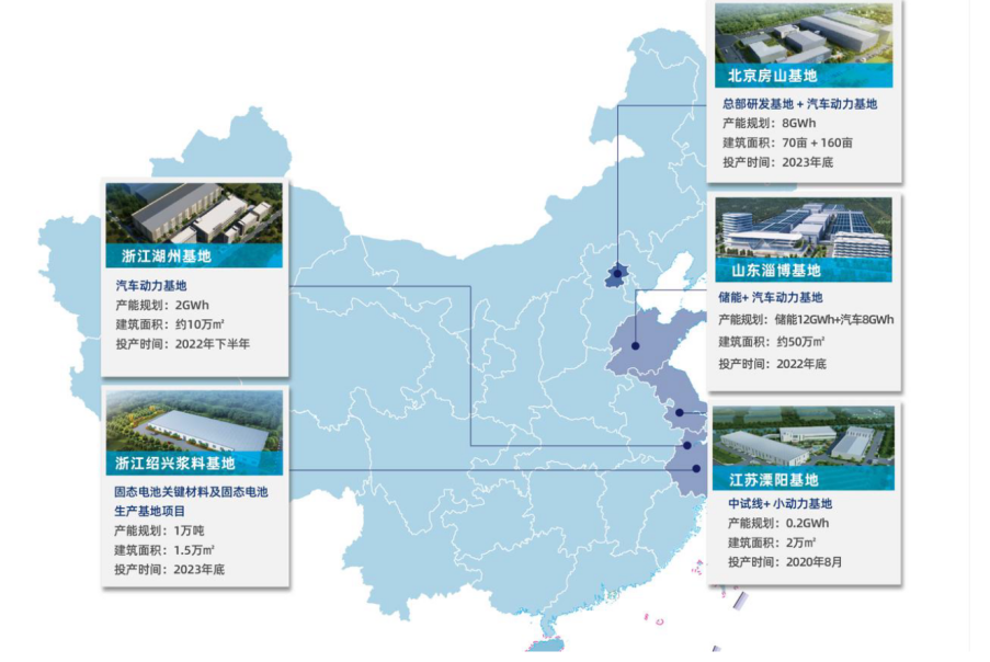 来源:卫蓝新能源官网,集邦新能源网,ofweek锂电网卫蓝新能源在生产进度方面展现出良好的发展势头。公司拥有四大生产基地,分别位于北京房山、江苏溧阳、浙江湖州和山东淄博,规划总产能超过100GWh。其中,湖州基地于2022年11月成功下线第一颗固态动力电芯,并在2023年6月正式向蔚来交付了半固态产品。卫蓝新能源预计将在2027年实现全固态电池的量产,标志着其在固态电池领域的持续创新和技术进步。