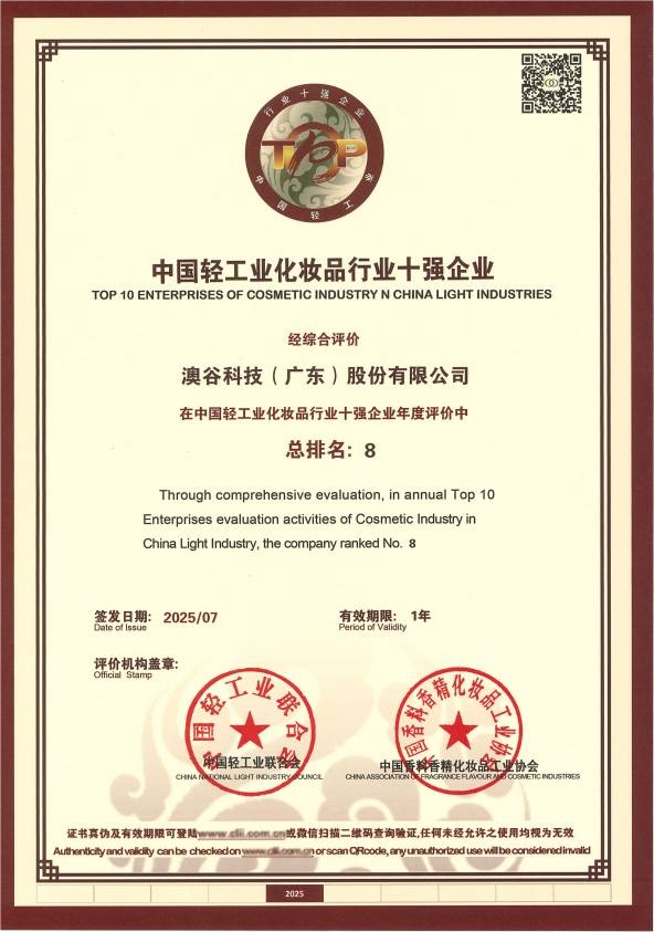 近期,中国轻工业联合会公布2024年度中国轻工业行业十强企业统计评价结果广盛网,阿道夫集团旗下的澳谷科技(广东)股份有限公司荣耀入选化妆品行业十强企业。这一荣誉,无疑是对阿道夫集团综合实力的权威认证,更是对集团始终坚持科技驱动、创新引领发展路径的高度肯定。